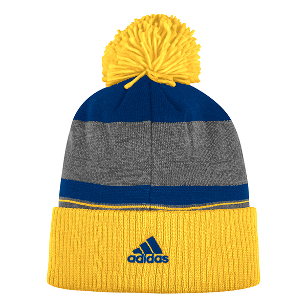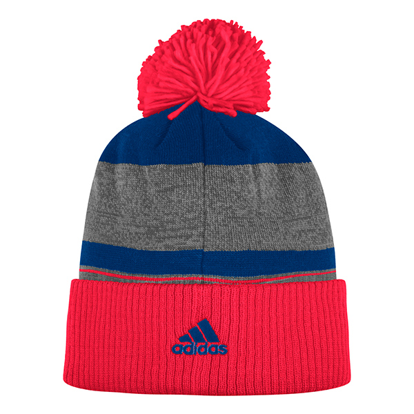 ADIDAS NHL Cuffed Pom Knit Hat is 100% Acrylic & features a heather grey stripe with team color jacquard on crown. Tonal team logo embroidered on front cuff. Team name jacquard on crowl. Adidas logo on back cuff.