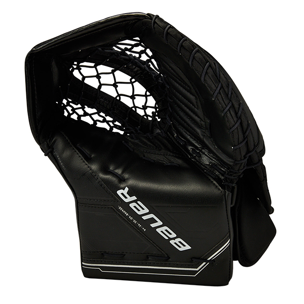 BAUER Supreme Mach Catch Glove features a Range of Motion wrist strap, CATCHGRIP+ Palm liner, CURV Reinforced rebound control foam + PORON palm protection, Neoprene Leverage Strap for Full Opening thumb, CURV Reinforced cuff + Perimeter,and a Double T pocket
