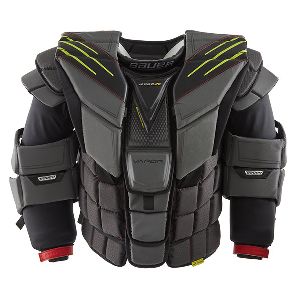 The Bauer Vapor HyperLite Chest & Arm is an elite level chest protector that features Shock-Lite belly blocks, a dual collar adjustment, Shock-Lite Pro shoulder floaters and 360 wrap coverage.