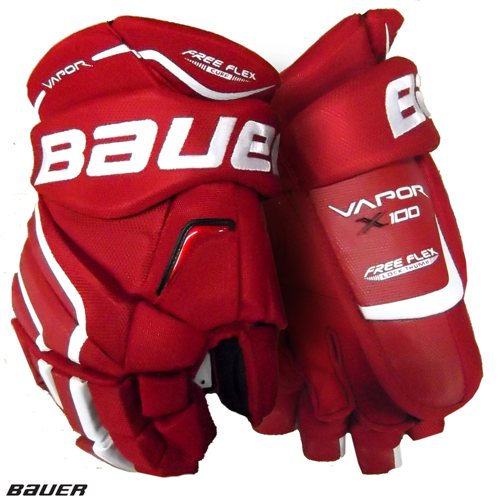 Check out the new Bauer Vapor X100 Glove! This model comes equipt with Poly inserts, Dual Density Foams and Comfort padding along with a 2-piece Free Flex lock Thumb and a mix of Synthetic leather and Nylon Mesh Shell.