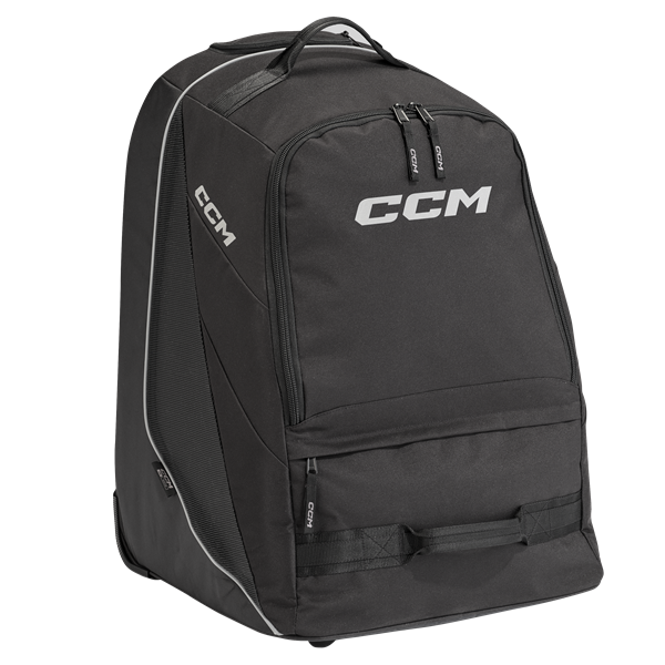 The CCM 590 Core Wheeled Backpack is built for durability and convenience with players of all levels in mind. Constructed with high-density 600D polyester and PVC coating, it's tough enough to handle the rigors of the season. Transport is effortless thanks to two heavy-duty all-terrain wheels and a telescopic handle. A spacious U-Shape opening main compartment with a YKK zipper provides reliable storage, while hideaway backpack strap allow for pick up and go if needed. Dedicated skate pockets internally and small accessory pockets help organize essentials, and the ID pocket makes it easy to identify your bag on the go. Finished with contrast lining and reflective CCM logo detailing.