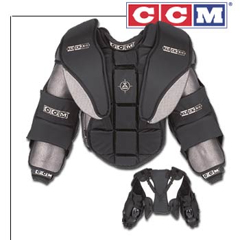 Designed to meet the needs of elite-level goaltenders through CCM's patented advanced engineering. AIR CONTROL TECHNOLOGY™ provides greater air circulation between the body and protection, while increased shoulder wing protection and molded poly side elbows offer improved coverage and increased protection. Two-piece foam rib with length adjustment at the back for better fit and protection.