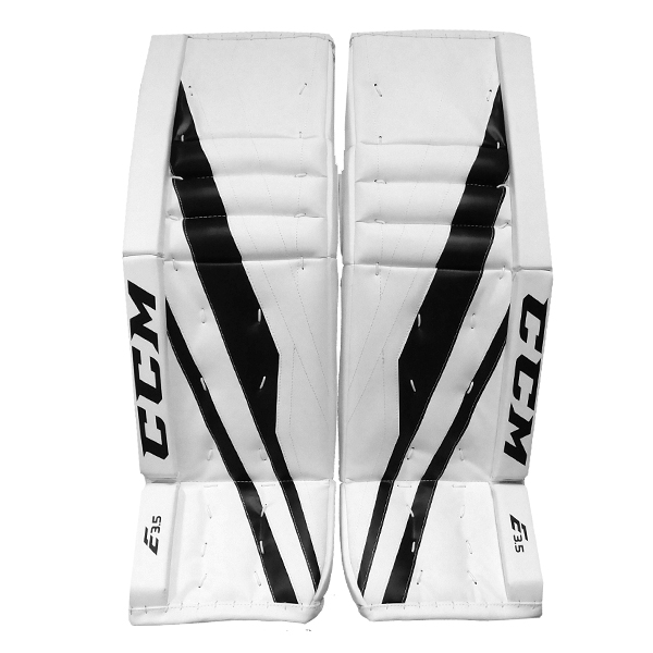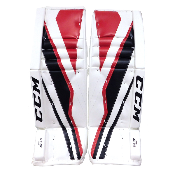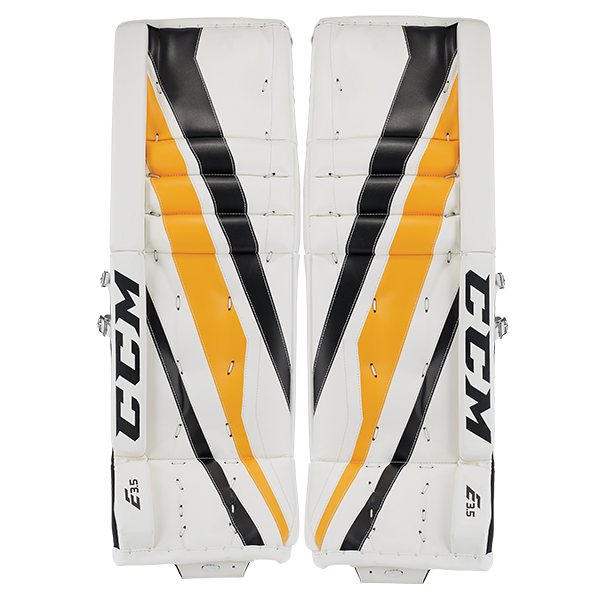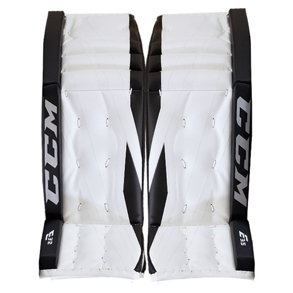 CCM Extreme Flex 3.5 Leg Pads feature a single break outer flex to maximize flexibility, a pre-curved single break core inner flex to close the 5 hole, a 90 degree boot flex with torsional flex for your power push, a deep ultra soft boot channel for freedom of movement, a tight fit 1 calf strap on the leg channel keeps the pads lightweight with a much closer feel to the leg for better control, a single adjustable knee strap system for a customizable fit, a soft foam outer knee wrap helps further close the 5 hole, a new lightweight / thin molded foam core offers a better weight balance for quicker transitions into (and out of) butterfly, a PE foam knee raiser seals the pad to the ice, and a legal thigh protector that protects the top of the knee.