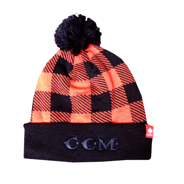 The CCM Holiday Plaid Pom Knit Hat is a season inspired knit hat with plaid pattern, a soft polar fleece lining, and a fine fringe pom. CCM vintage embroidered tone on tone logo. Tiny leaf woven label as branding. 100% Acrylic
