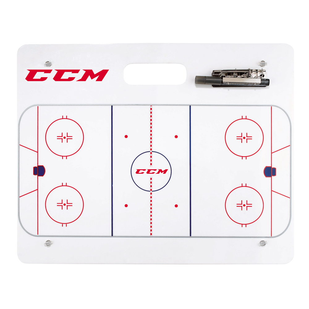 The CCM Coaching Boards are a PE Construction with clip for erasable marker, a large board with full ice view is featured and a black erasable marker is included. The Jumbo board is the larger board and features the built in handle.