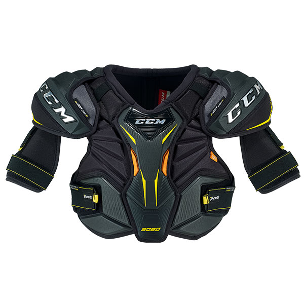 CCM Tacks 9080 Shoulder Pads feature dual-layer stretch base jacket construction with an adjustable strap system, JDP shoulder caps with D30® smart material, HD foam kidney protection as well as a(n) removable belly pad, customizable bicep adjustment, molded PE floating sternum with D30® smart material, molded PE floating spine, and a comfort base and mesh liner.