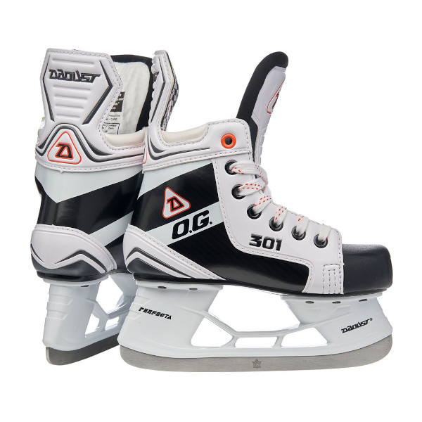 After decades of silence, Daoust returns to the ice with a renewed commitment to craftsman , innovation, and performance. The new Daoust skate line honors the brand's legendary roots while embracing modern engineering to meet the demands of today's fast pace game. Daoust has re-imagined the 301 as a price point option with a distinct retro flair. While the 301 offers a uniquely vintage feel, the design is unmistakably modern, and comes in both a black OG and white Taboo model. Featuring a 40/60 composite boot, and the Perfecta Kwik-1 Rapid Release Holder, the 301 is designed as the ultimate skate for developing players. This is more than a comeback, it's the revival of a classic built for a new generation.