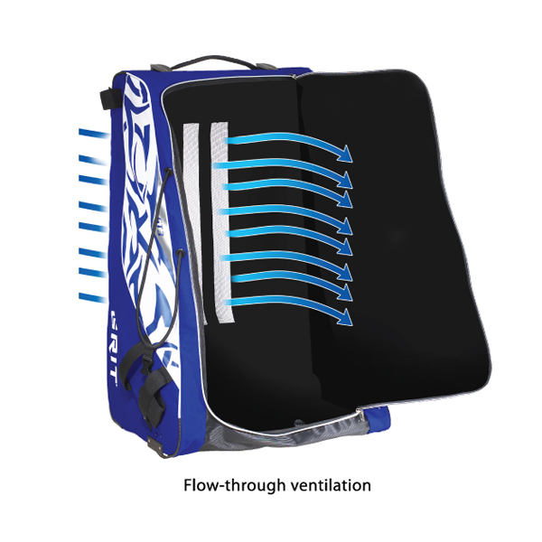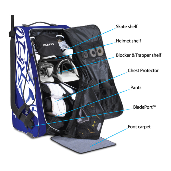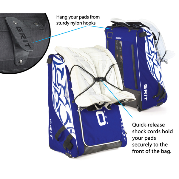 GRIT GT4 Sumo Goalie Tower Bag – 36” features equipment shelves with mask cover, a mesh bag, foot carpet, bladeport, and accessory pockets. Torsion Technology™ frame combines steel and composite rods allowing bag to move and flex while under pressure. Folding frame. Flow-through ventilation. Upgraded graphics.