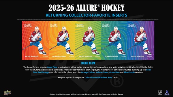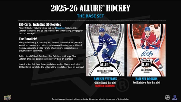 • The parallel lineup is stunning and diverse. From color and pattern variations to color and pattern variations with autographs, Allure Hockey appeals to a wide variety of collectors, especially auto, player and set collectors.