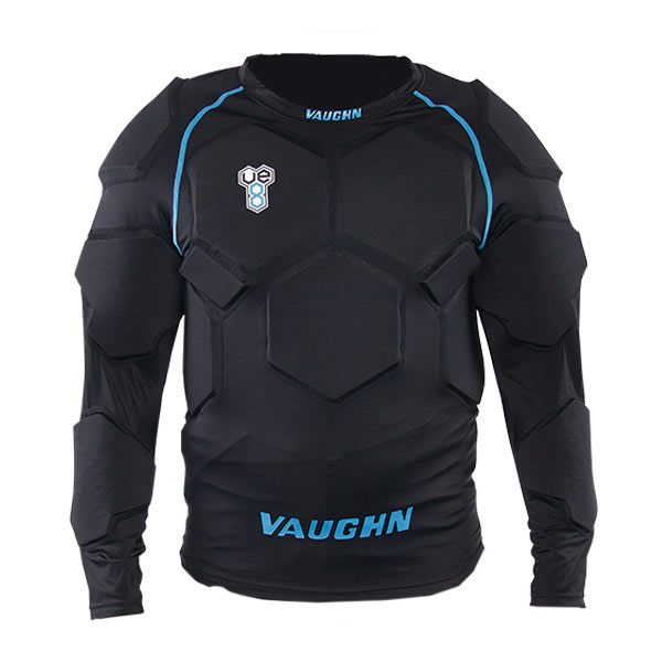 VAUGHN Velocity VE8 Padded Goalie Compression Shirt features the base layer compression shirt, a large body cut that allows for flexibility to fit goaltender movements without restriction, a moisture wicking fabric for cool play, an arm padding placed for proper alignment from impacts, removable padding in pockets for each section to allow for washing or customization of each pad, and EVA foams that form to body for fit.
