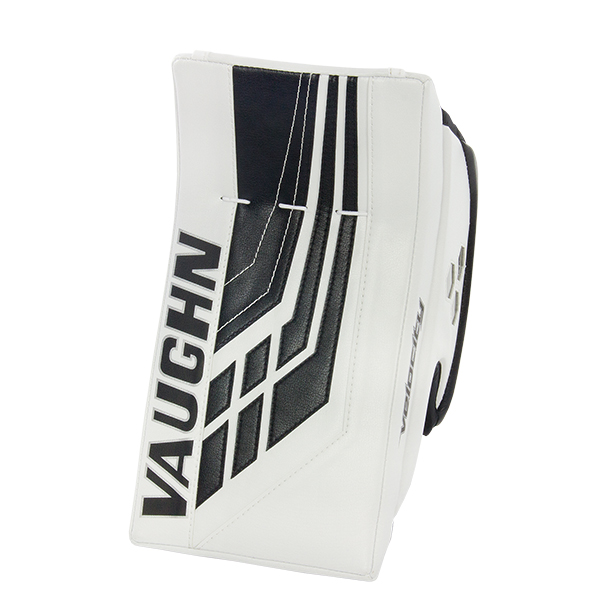 VAUGHN Velocity VE8 Pro Goal Blocker features a flex cuff that improves board positioning, VX suede palm with mesh gussets and a grip texture overlay, solid side shield with HD and carbon fiber insert, a side shield deflecting rail, large finger protectors with elastic straps, reinforced finger protectors, dual side index finger guards, a new visually disruptive graphic, full coverage formed finger protectors, higher hand position of the palm attachment to the board, laced down front face for greater puck deflection and glove durability, fully adjustable wrist strap, a tapered side profile for board shape, and a VX suede palm with grip overlay construction.