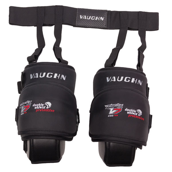 The Vaughn XR Pro Knee/Thigh Guard features a pro three piece design for flexibility, a large double shield for added protection and laces on for further adjustment, high density polyethylene molded components for shock dispersal, clarino synthetic leather on knee exterior for durability, and Nash® Clarino on inner knee for grip and durability. Guards feature a wrap around design to extend protection to both inner and outer sides of the leg and has three adjustable straps for precise adjustment. A top thigh strap with urethane grip strips on elastic provide added security. Full flexibility with three piece hinged design, and a garter belt attachment at waist to hold pad in place and features a vertical legl length adjustment.