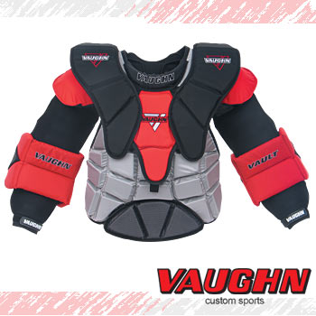The new Vault pro arm and chest protector features an anatomically designed body pad with angled protective blocks arranged to align the flex points of the chest pad to match body movements. This also allows the unit to keep the protection properly positioned for increased comfort and protection. Dura-mesh arm base construction provides added ventilation and flex to provide quick break-in and comfort. Wide profile shoulder floaters with flex points give greater net coverage and increase the range of motion in the shoulder areas. Large reinforced sternum plate adds extra protection to the critical area in the chest. Wide arm floaters add protection and feature solid construction with high density inserts to provide added stability under impacts for better puck deflection.